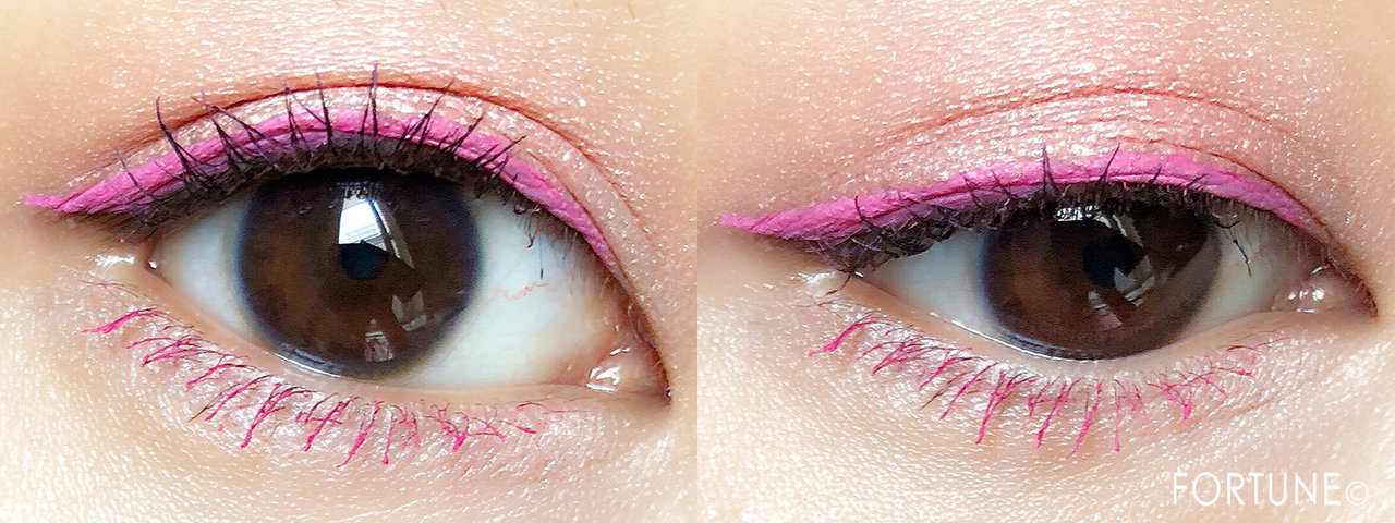 パキっとしたビビッドなピンクでインパクトのある目もとに。アイメイクにピンクを使うと腫れぼったくなっていまいがちですが、インラインにしっかりブラウンやブラックでライン描くとぼやけた印象にならず、くっきりした目もとに仕上がります。この写真のメイクは、インラインにブラウンを使用しています。