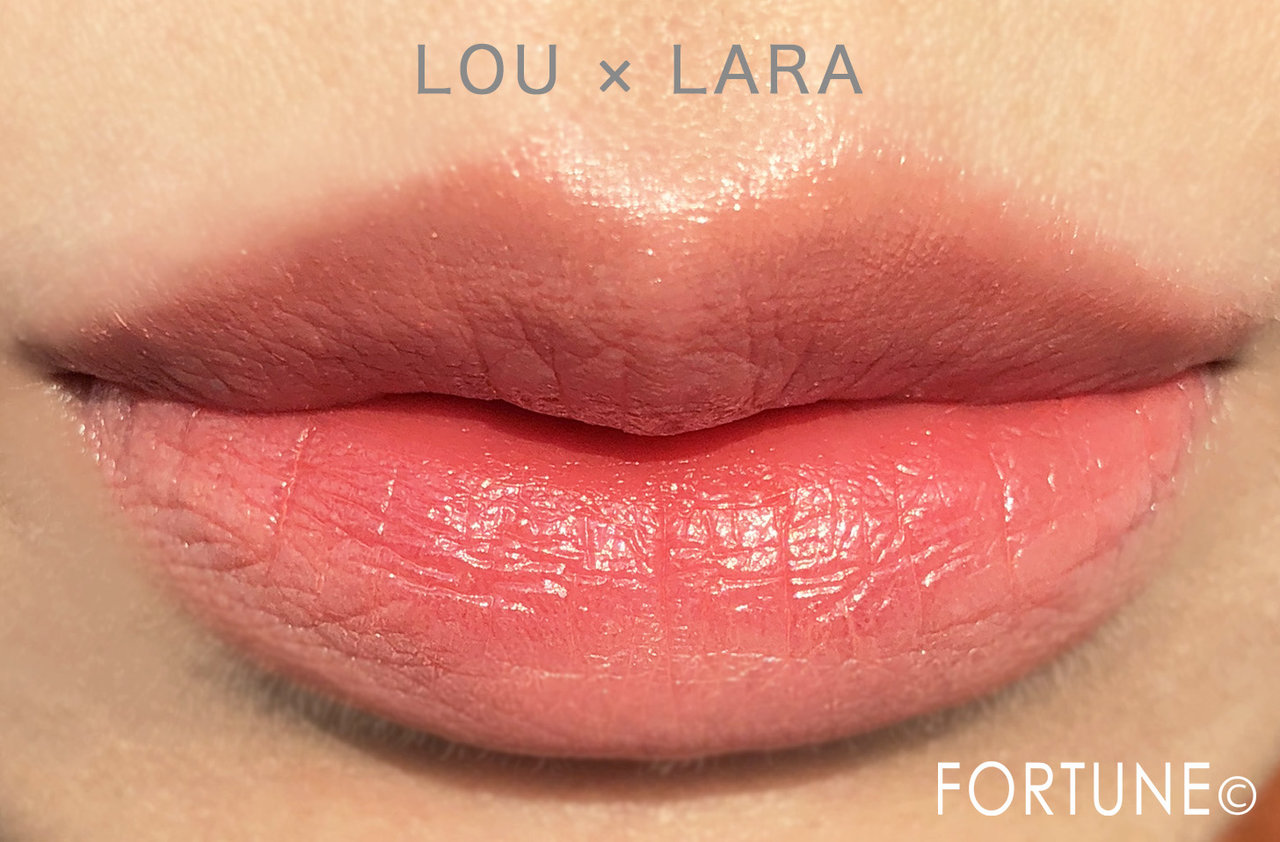 2856LARA単品で仕上げると、蛍光オレンジカラーに発色しますが2853LOUをベースにする事で全体的に柔らかいコーラル系の発色に。万人受けするあどけないコーラルグラデリップに仕上がります。