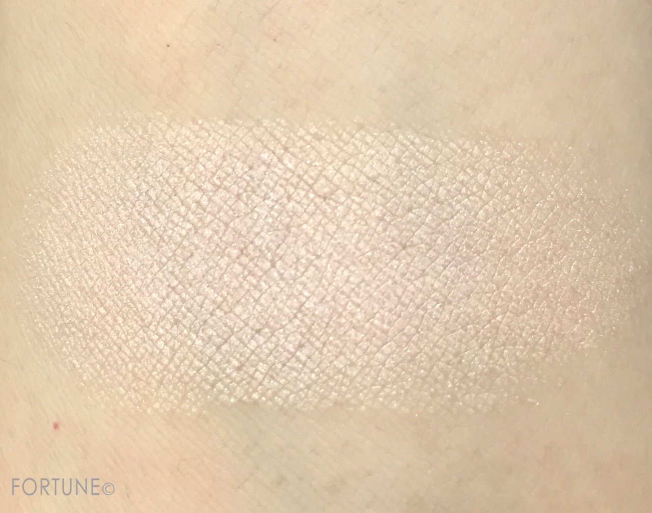 微細なパールがふんわりと輝き、ギラつく感じは全くありません。とてもソフトでシアーな発色です。少しピンクがかった色なので肌馴染みがよく、さっと馴染ませれば浮いた感じもありませんよ。