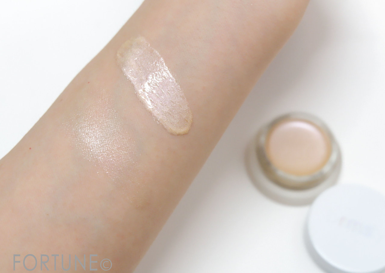 肌にのせてみた感じがこちら。上はたっぷりテクスチャーが分かるように。下は軽く取り肌に馴染ませるようにのせてみました。