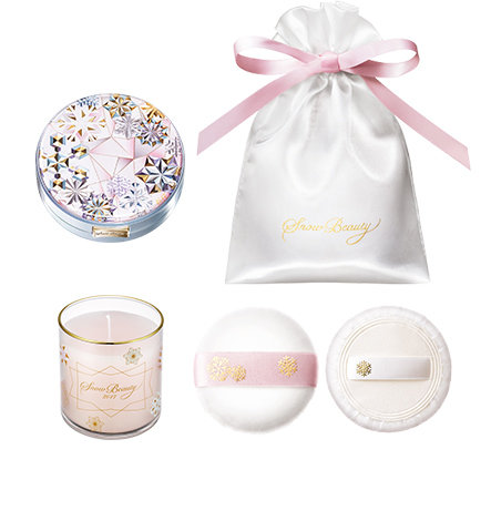 通常はスノービューティーホワイトニングフェースパウダー、専用アミュレットポーチ、そしてパフ2枚のセットで販売されていますが、今回は数量限定、そしてワタシプラス限定でオリジナルキャンドルが付いた特製セットが発売中!