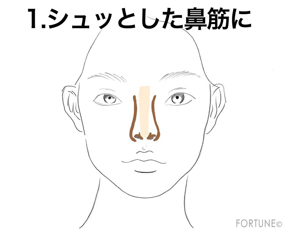 鼻を高く、シュッと見せたいなら、眉頭の下から小鼻に向けて鼻の側面部分にシェーディングカラーで縦にラインを引きます。