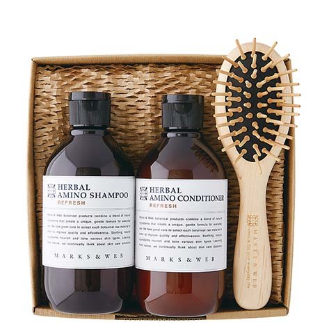 マークスアンドウェブの定番ヘアケアギフトセット!カエデ材を使ったウッドヘアブラシは、頭皮への刺激が心地よく、髪を優しく解きほぐしてくれるブラシ。また泡立ちの良い、なめらかな指通りのシャンプーとコンディショナーがセットなので、洗うときも、乾いた時もしっかりケア出来るヘアケアギフトです。