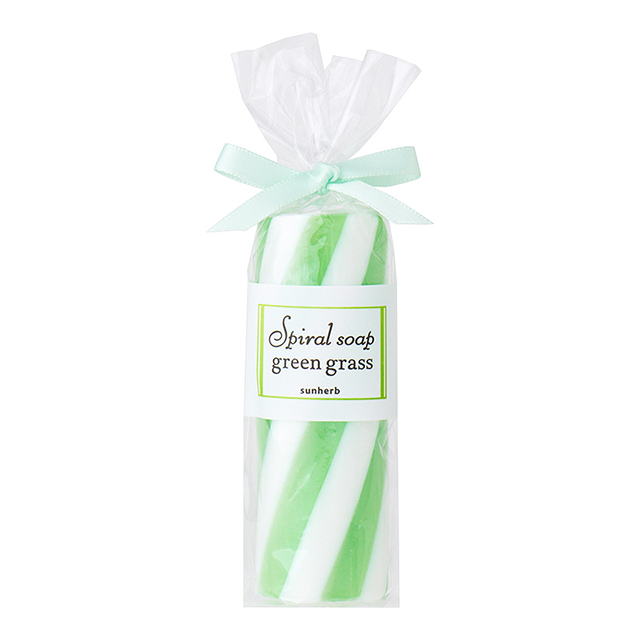 『サンハーブ スパイラルソープ グリーングラス』は、グリーンとホワイトの爽やかな大人向けの石けん。石けんの香りは暑い夏にもオススメ、爽やかなグリーングラスの香りです。