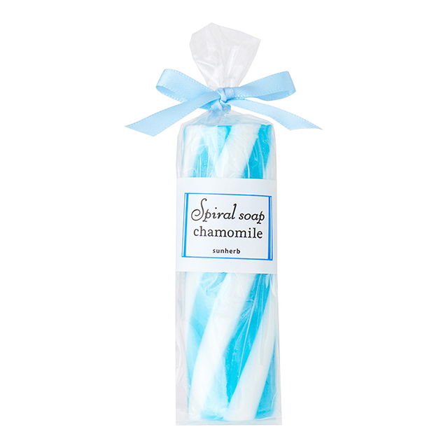 『サンハーブ スパイラルソープ カモマイル』は、涼しげな水色と白のスパイラルが特徴の可愛い石けん。石けんは、女性に人気の優しい甘さ・・・カモマイルの香り。アロマの香りで癒されちゃおう♪