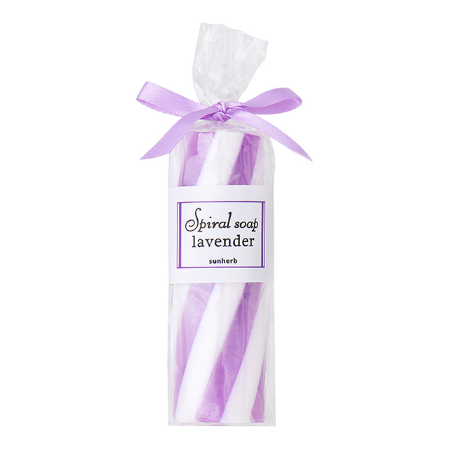 パープルとホワイトのスパイラルが特徴の、『サンハーブ スパイラルソープ ラベンダー』。ラベンダーのパープルは色だけでなく、ラベンダーの爽やかな香りも付いていてリラックスしたい時にピッタリ♡