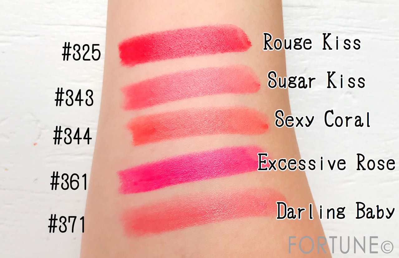 写真左から、「#325 Rouge Kiss」、「#343 Sugar Kiss」、「#344 Sexy Coral」、「#361 Excessive Rose」、「#371 Darling Baby」になっています。かすかにするバニラとバイオレットの香りが、ベリーの香りと調和しています。