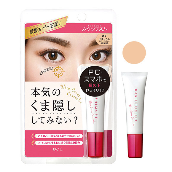 さっそく下まぶたメイクに挑戦してみましょう。まずは下瞼のくすみをコンシーラーで取り除きます。繊細な目元に使用するので、リキッドタイプや肌当たりの柔らかいペンシルタイプがおすすめです。「カクシマスト ウルトラカバーコンシーラー」は3D構造のゲル膜が、目の周りの凸凹にピタッとフィットして崩れにくくおすすめです。3色のブロッキングパールを配合し、光の反射でクマをカバーします。