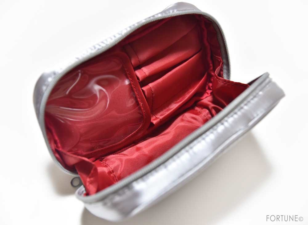 中は鮮やかで美しいレッド。ブラシやペンシルも入れやすく、小物を収納できるポケット付き。