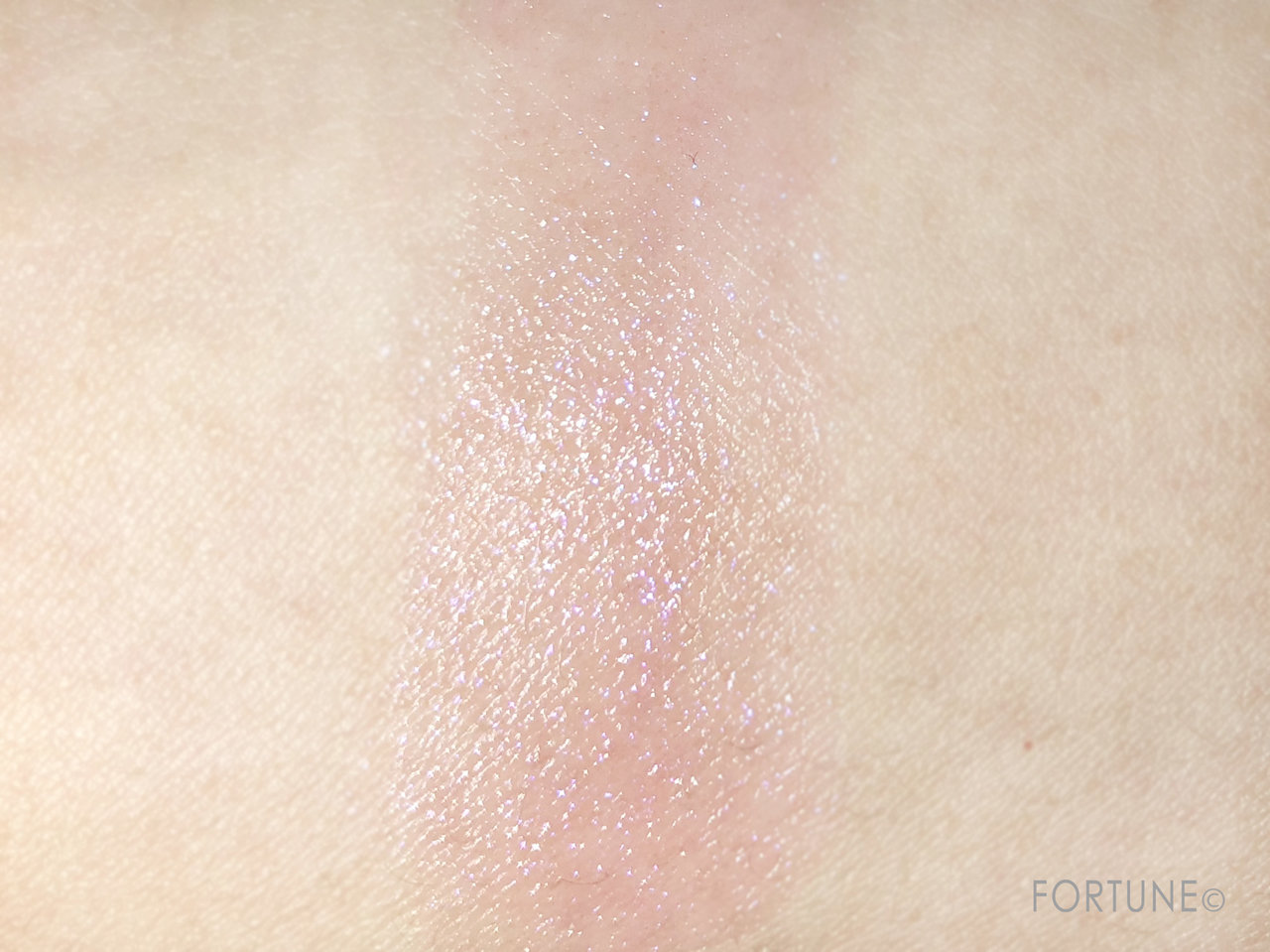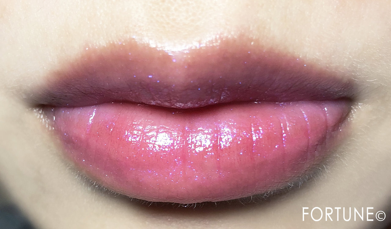アディクトリップグロウ「ホロパープル」のラメの量はこんな感じです。かなりぎっしり入っています。細かく、小さめのラメで、ギラギラ派手にならず、綺麗な光沢が出せます。光があたる角度によって、ブルーラメがキラキラ輝きます。香りは、既存のアディクトリップグロウと同じ、美味しそうな、ほのかに甘い香りがしました。