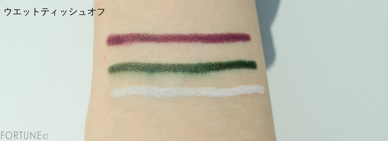 その証拠に、ウエットティッシュでオフしても綺麗に色が残ってくれました。水・汗・よれ・くずれ・にじみに強いロングウェア処方なので安心です。