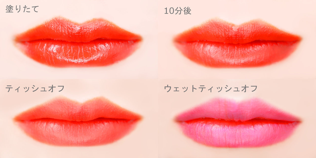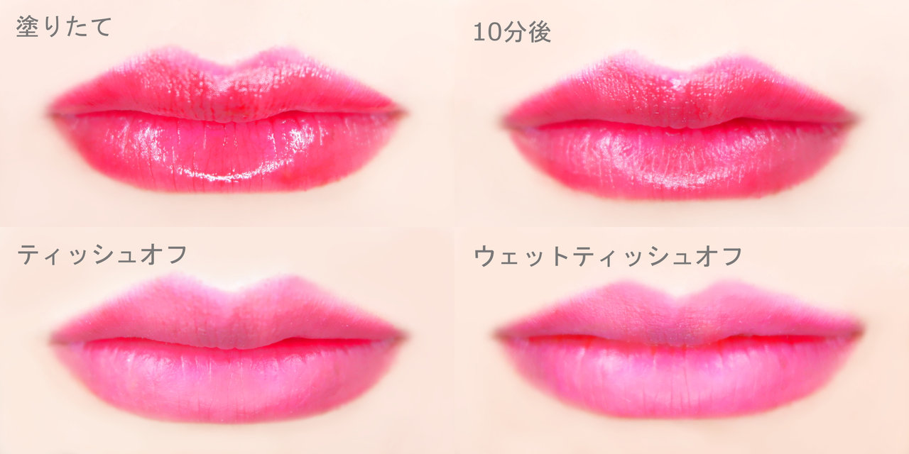 ティッシュオフするとややマット感が増しますが、色味はほとんど変化がありません。
