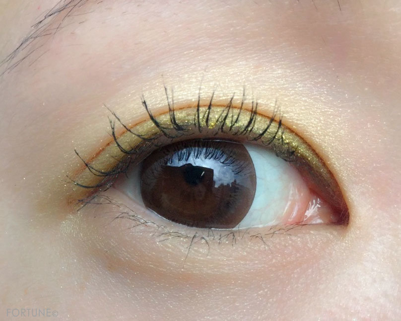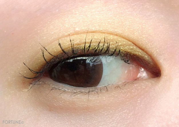 カジュアルなお洋服の時は、これにマスカラのみ。もっと華やかにしたい時は、下まぶたにもゴールドをオン。