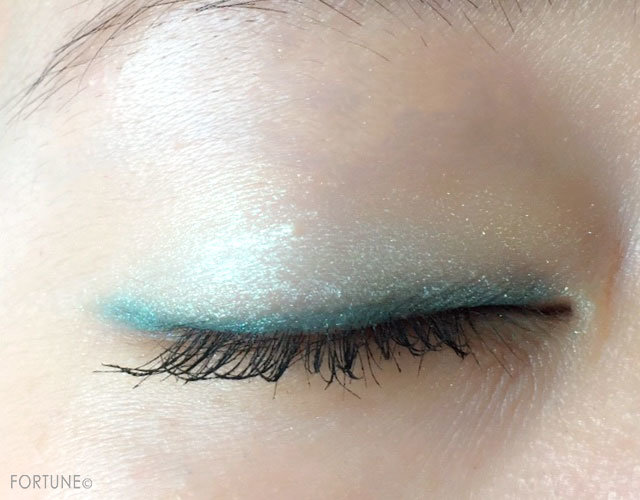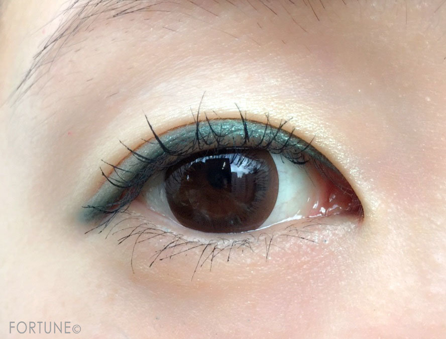 次に03:ゴールドイエローの時とは違い、濃いグリーンの色を目のキワに沿ってラインを引くように入れていきます。この時、目尻は長すぎないようにしましょう。そうすることでやり過ぎ感の無いメイクに仕上がります。
