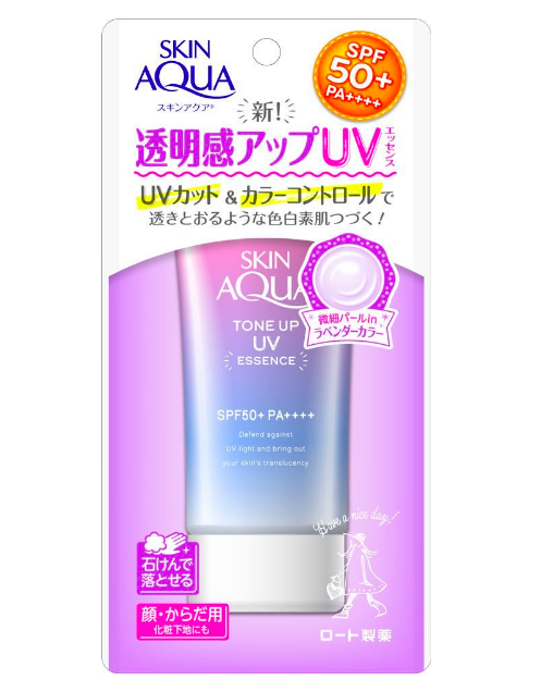 スキンアクアの『トーンアップUVエッセンス』も、ラベンダーカラーの日焼け止めになります。微粒子パールが配合されている日焼け止めなので、ツヤ感のあるお肌に☆化粧下地としてSNSでも人気を集めているアイテムなので、試してみる価値あり♡石けんでオフできるところもポイント。