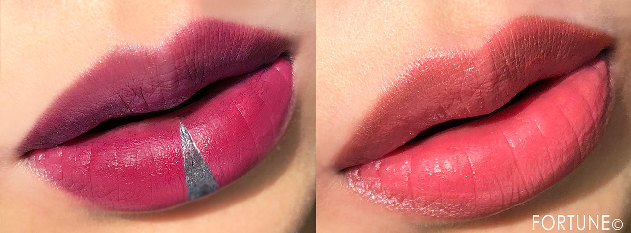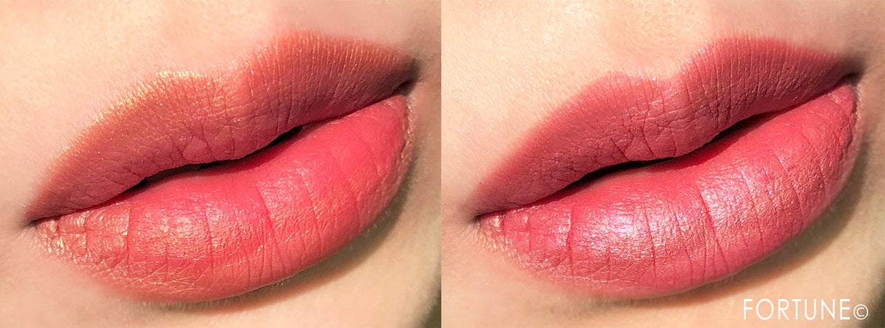 写真左側のリップカラーはローズフローズ使用。ライナーはブロンスオーを使用しています。外側の輪郭全体をライナーで囲ってから内側に向かって馴染ませます。