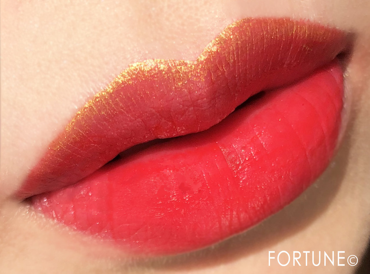 ゴールドワオを使って、ハイライトっぽくリップラインを。内側にぼかす時は指を使ってスタンプするようになじませると上手くできます。リップカラーは、ヤズレッドを使用。