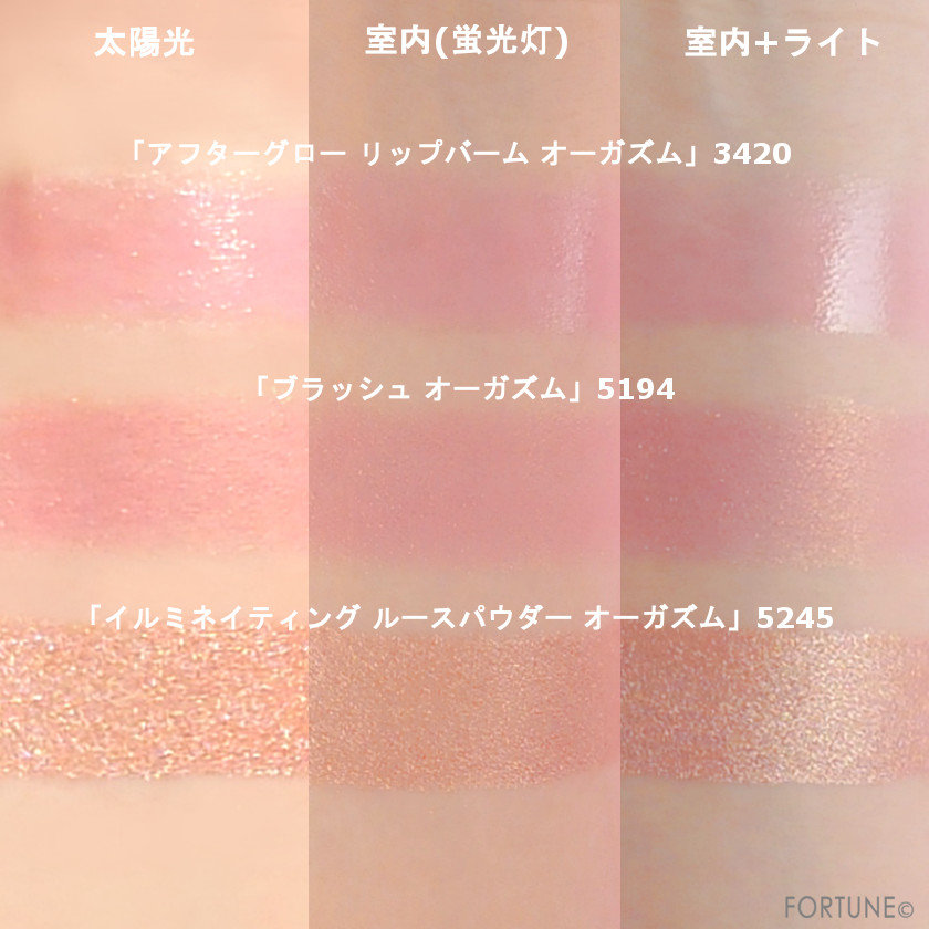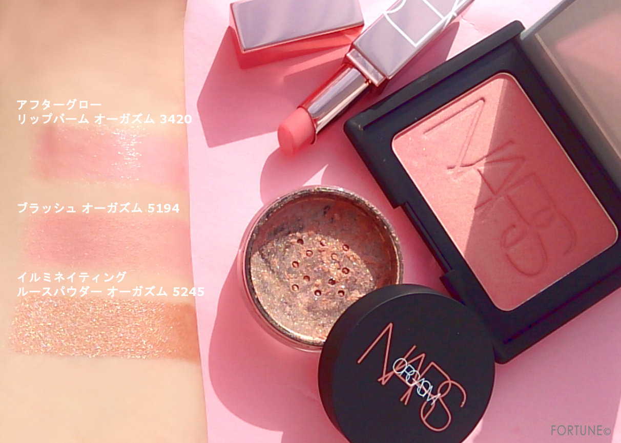 NARS「オーガズム」シリーズ新作「ブラッシュ オーガズム」「イルミネイティング ルースパウダー オーガズム」「アフターグロー リップバーム オーガズム」の詳しいカラーをスウォッチでチェックしましょう。