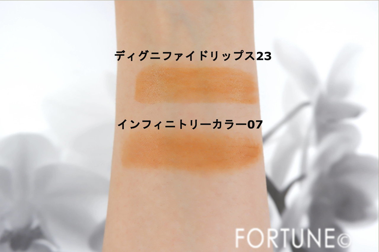 スウォッチでは発色の良いオレンジの印象でしたが、リップに塗ってみるとディグニファイド リップスの特徴である透け感により、唇の色と混ざってナチュラルでヘルシーな印象に!みずみずしく生っぽい、ジューシーな質感もたまりません♪