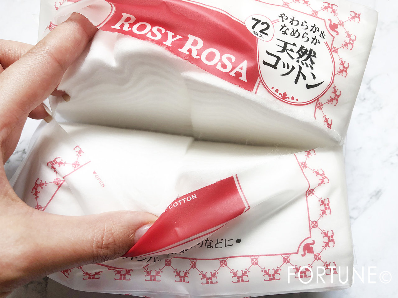 ロージーローザの天然コットンは、頬全体が隠れるほどの大判タイプ!優しい肌触りで肌に刺激を与えにくいのが嬉しいポイント!ふわふわなので化粧水の含みもよく、たっぷりパッティングする事ができます。