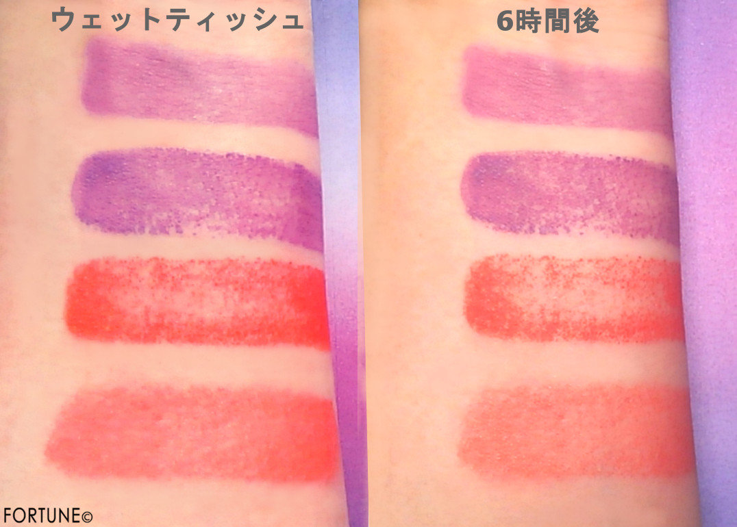 また、その状態から6時間ほど放置したのですが、ウェットティッシュで擦った直後と色落ちにほとんど変化がないほどの色持ち!