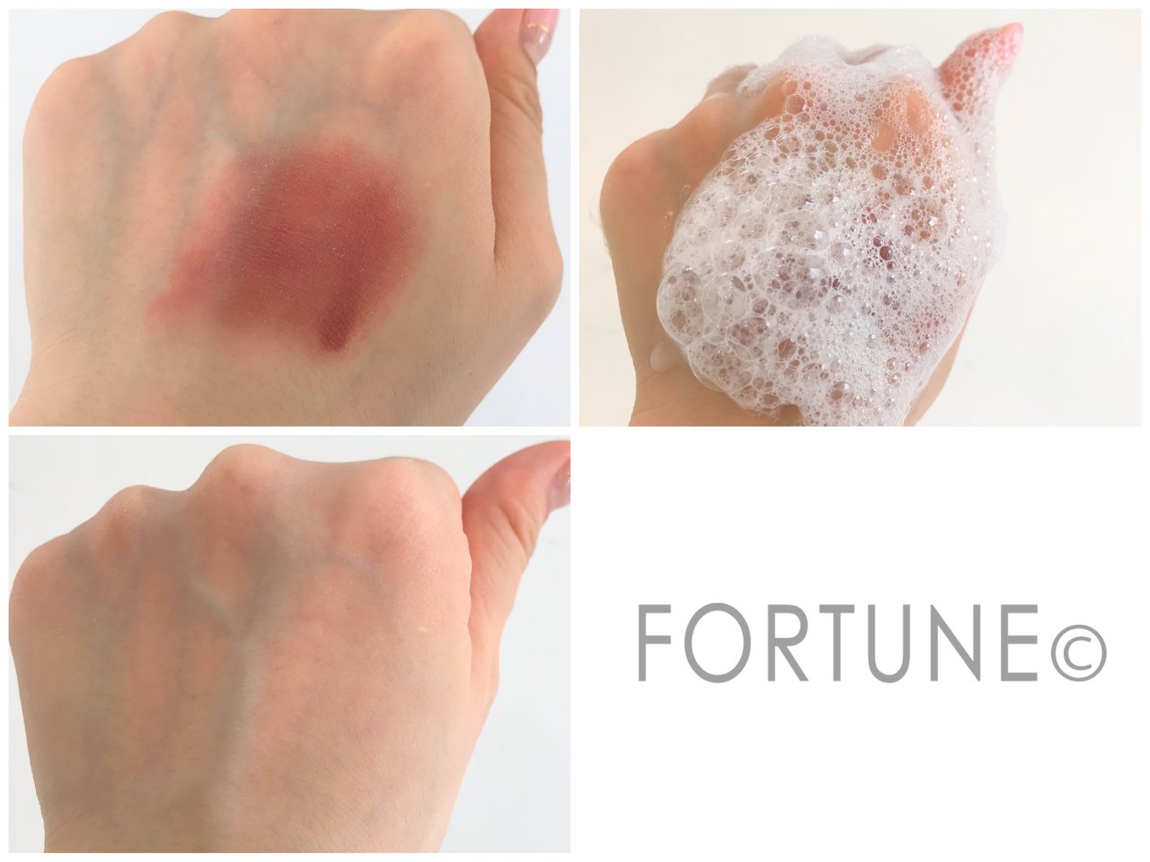 そこで「オーガニックデュオアイシャドー 04〈キャラメルフィグ〉」のボルドーの色を手の甲に3度しっかりと重ね塗りをし、一般的な洗顔料を泡立てて優しく30秒ほど洗ってみました。