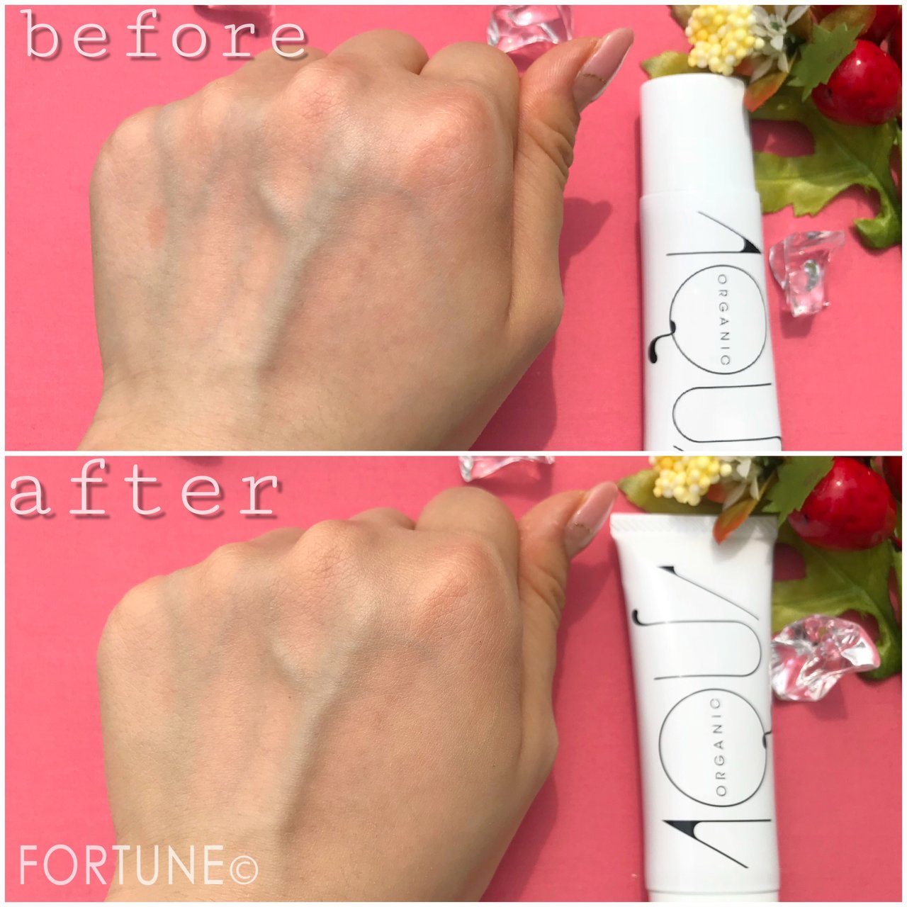 塗布後はお肌がワントーン明るくなり、色ムラが補正され均一になりました。