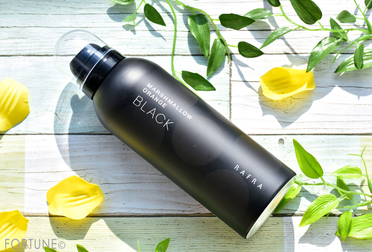 この【マシュマロオレンジ ブラック】はブラックというだけあって、黒に水玉がスタイリッシュなボトルからは、キメ細かい濃密な真っ黒い泡が!!