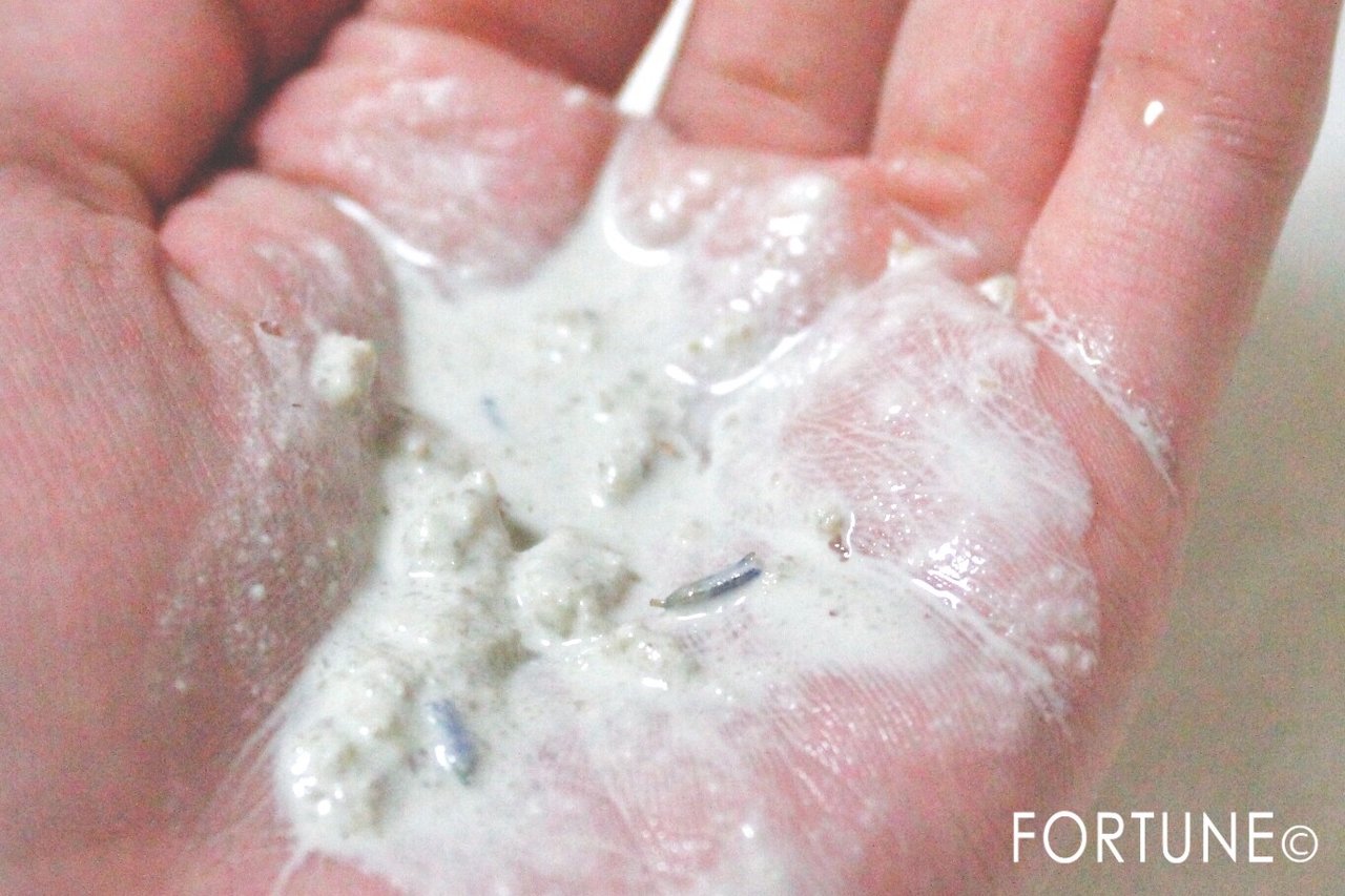 水としっかり混ぜ合わせることで、アーモンドパウダーがクレンジングミルクとなってお肌を優しく洗いあげます。