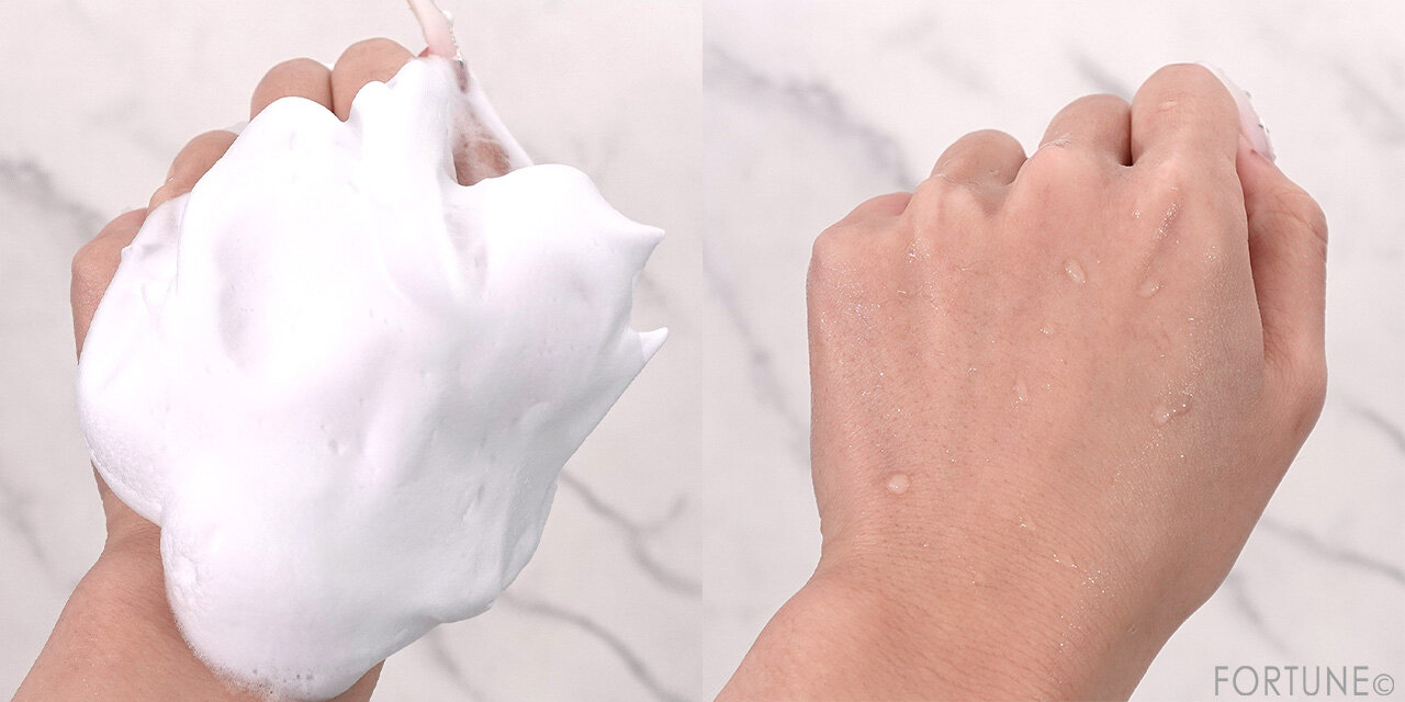 少量でもしっかり泡立つ、泡立ちの良いテクスチャー。少し泡立てるだけで濃密でキメ細かいもっちり泡が手一杯に広がりました。